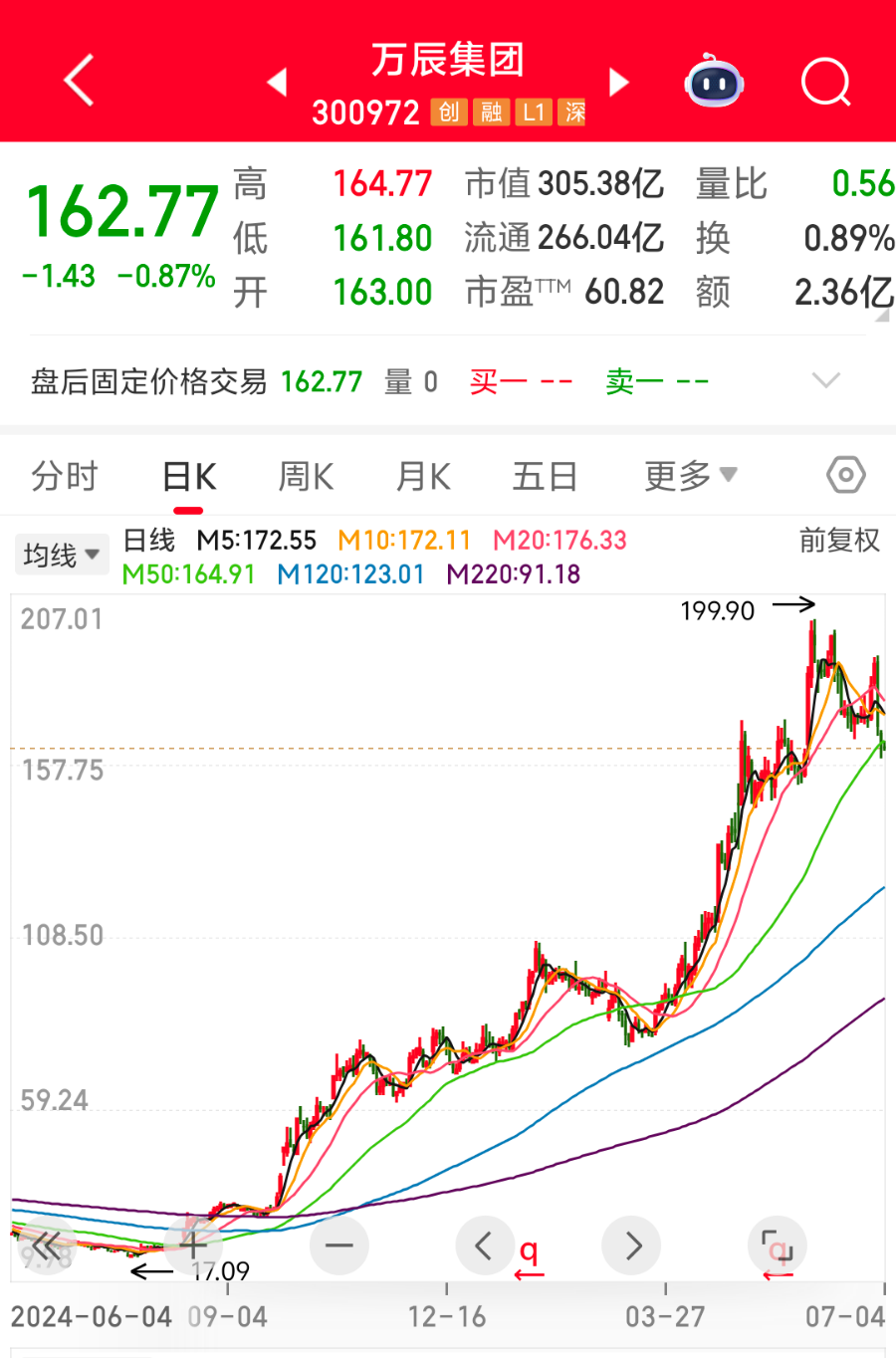 7月1日,万辰集团公告称,高管减持计划已实施完成,三人的减持均价分别为171.67元/股、170.49元/股、171.29元/股。